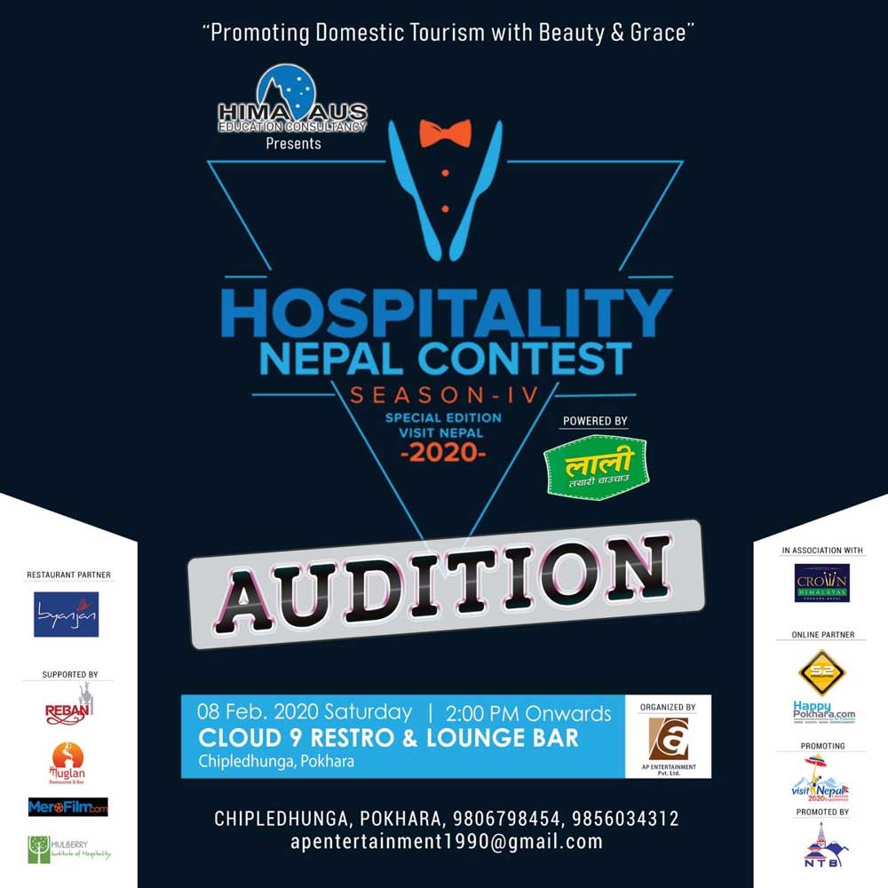 पोखरा । चौथो संस्करणको ‘हिमा–अस हस्पिटालिटी नेपाल कन्टेस्ट’ स्पेसल अडिसन फर भिजिट नेपाल २०२० को अडिसन शनिबार हुने भएको छ । अडिसन पोखरा चिप्लेढुङ्गास्थित क्लाउड नाइन रेष्ट्रोमा हुने आयोजक एपी इन्टरटेनमेन्टका प्रबन्ध निर्देशक अर्जुन पाण्डेले जानकारी दिए ।