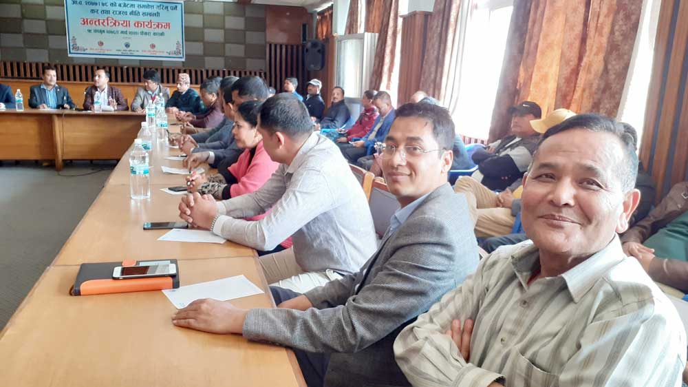 कार्यक्रममा मदिरा व्यवसायी संघ कास्कीका अध्यक्ष रुपनारायण भुजेलले मदिराको अवैध व्यापार फस्टाउँदा वास्तविक व्यवसायी मर्कामा परेको बताए । पोखरा उद्योग वाणिज्य संघका पूर्वकार्यसमिति सदस्य डिबी भुजेलले अवैध व्यापारले बजार अस्तव्यस्त भएको गुनासो गरे । संघको कार्यसमितिका अर्का पूर्वसदस्य हीरामणि पण्डितले निजी जग्गामा भएका काठ किन्न र बेच्न पाउनुपर्ने माग गरे । पोखरा उद्योग वाणिज्य संघका कार्यसमिति सदस्य तारानाथ ढुंगानाले नेपाली घरेलु रक्सीको ब्राण्डिङ हुनपर्ने माग गरे । नेपाल उद्योग वाणिज्य संघ गण्डकीका सदस्य कुविरकुमार श्रेष्ठले व्यवसायी मैत्री कर प्रणालीले मात्रै राजश्व उठ्ने तर्क गरे । कपडा व्यवसायी संघका अध्यक्ष विष्णुप्रसाद तिमिल्सिनाले कपडाको अवैध ब्यापार भन्सारबाटै रोकिनुपर्ने माग गरे । पोखरा महानगरपालिकाका कर अधिकृत शिवहरि शर्माले कर सहयोगीको हातमा करोडौँका कारोवार नसुम्पिँन व्यवसायीहरुसँग आग्रह गरे ।