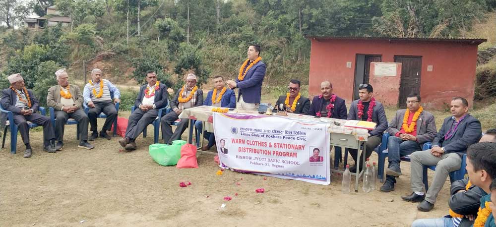 लेखनाथ, १३ मंसिर । लायन्स क्लब अफ पोखरा पिस सिभिकको आयोजनामा न्यानो कपडा वितरण कार्यक्रम शुक्रबार सम्पन्न भएको छ । पोखरा ३१ बेगनासको गोल्ठेपानीमा रहेको विश्वज्योति आधारभूत विद्यालयका विद्यार्थीलाई कपडा वितरण गरिएको हो । विद्यालयका ३८ जना विद्यार्थीलाई कपडा वितरण गरिएको क्लबका अध्यक्ष युवराज खनालले जानकारी दिए ।