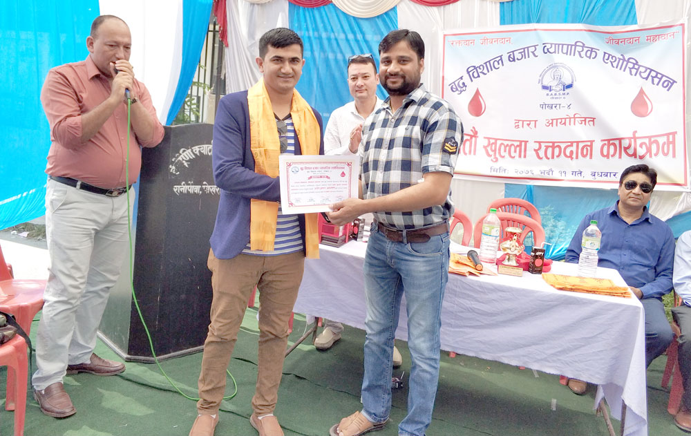 पोखरा । बुद्ध विशाल बजार व्यापारिक एसोसिएसनद्वारा बुधबार आयोजित रक्तदान कार्यक्रममा ६६ जनाले रक्तदान गरेका छन् । संस्थाले वार्षिक कार्यक्रम अन्तर्गत रक्तदान कार्यक्रम आयोजना गरेको हो ।