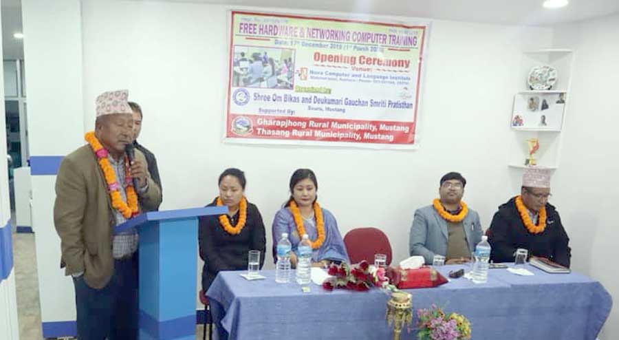 घरपझोङ तथा थासाङ गाउँपालिकाको सहयोगमा नोभा कम्पयुटर एण्ड ल्याङग्येज इन्स्टिच्युट महेन्द्रपुल पोखरामा तालिम सुरु भएको छ । तालिमको पुस १ गते मंगलबार प्रतिनिधिसभा सांसद प्रेम प्रसाद तुलाचनले उद्घाटन गरे । कार्यक्रममा बोल्दै प्रमुख अतिथि तुलाचनले शिक्षकहरुको क्षमता विकास तथा प्राविधिक शिक्षाको ज्ञान बढाउन तालिम सहयोगी हुने विश्वास व्यक्त गरे ।