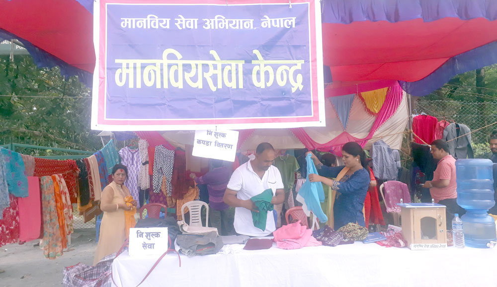 यसरी एउटा गाउँलाई नै खुशी दिने काम मानवीय सेवा अभियानले गरेको हो । जसले निःशुल्क कपडा वितरण गर्दै आएको छ । शुरु शुरुमा गरीब तथा असहायःहरुलाई निःशुल्क भोजन गराउँदै आएको मानवीय सेवा केन्द्रले यस वर्षको साउनको पहिलो सोमबारदेखि निःशुल्क कपडा वितरणपनि शुरु गरेको हो । हाल फरक÷फरक ठाउँमा स्टल राखेर कपडा वितरण गर्ने गरिएको छ । सँधै एउटै मान्छे नआओस् भनेर फरक÷फरक ठाउँमा कपडा वितरण गर्ने गरिएको हो ।