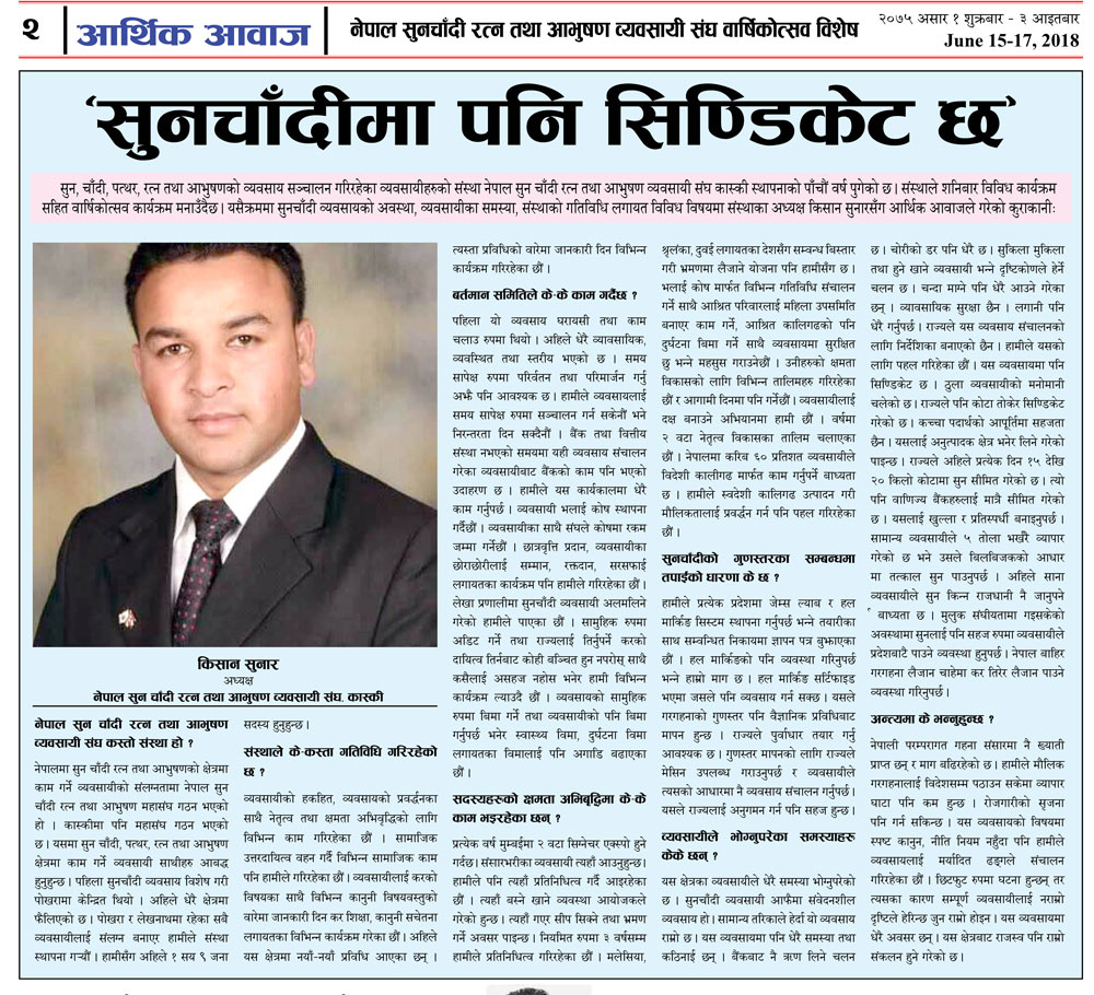 सुन, चाँदी, पत्थर, रत्न तथा आभुषणको व्यवसाय सञ्चालन गरिरहेका व्यवसायीहरुको संस्था नेपाल सुन चाँदी रत्न तथा आभुषण व्यवसायी संघ कास्की स्थापनाको पाँचौं वर्ष पुगेको छ । संस्थाले शनिबार विविध कार्यक्रम सहित वार्षिकोत्सव कार्यक्रम मनाउँदैछ । यसैक्रममा सुनचाँदी व्यवसायको अवस्था, व्यवसायीका समस्या, संस्थाको गतिविधि लगायत विविध विषयमा संस्थाका अध्यक्ष किसान सुनारसँग आर्थिक आवाजले गरेको कुराकानीः