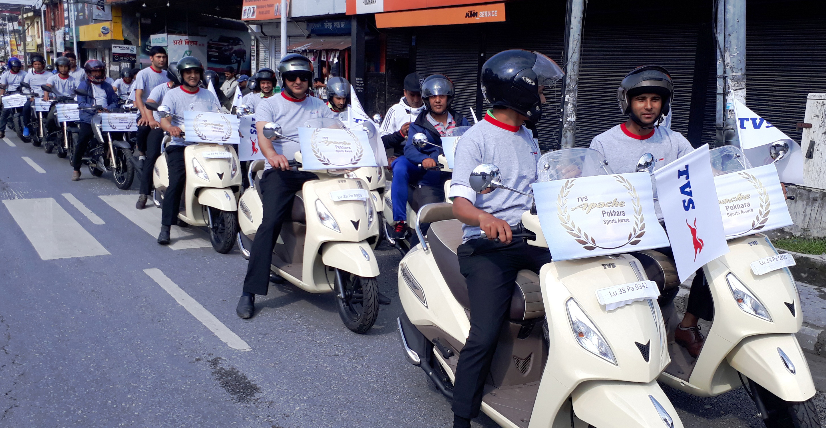 तेस्रो टिभिएस अपाचे पोखरा स्पोर्टस अवार्ड २०७४ को पूर्वसन्ध्यामा मुख्य प्रायोजक बतास ब्रदर्श प्रा.लि. र आयोजक नेपाल खेलकुद पत्रकार मञ्च कास्कीले विहीबार बिहान पोखरामा ¥याली निकालेको छ ।