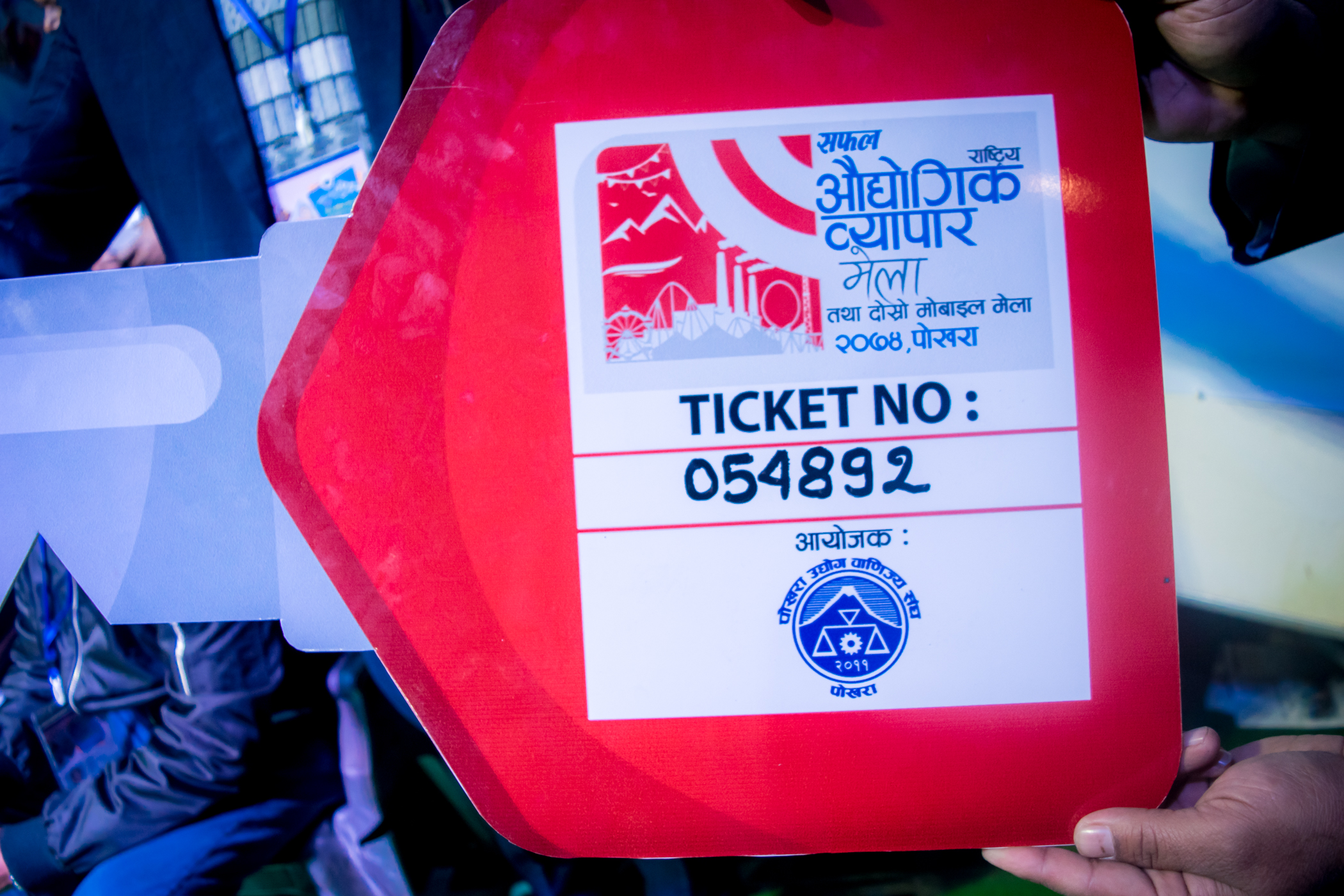 पोखरा, ८ माघ । खचाखच दर्शक । तालीसँगै बढ्दो धुकधुकी पनि । लहरै राखिएका ६ बटा गाग्री र गाग्रीमा राखिएका नम्बरहरु । पोखरा उद्योग वाणिज्य संघका महासचिव दामु अधिकारीले जब पहिलो नम्बर थुत्न पत्रकार टंक अधिकारीलाई आग्रह गरे, माहौल एकाएक सुनसान बन्यो । स्वभाविक रुपले उनले शुन्य नंवर निकाले । पोखराको नयाँबजारमा पुस २७ देखि माघ ८ गतेसम्म सफल राष्ट्रिय औद्योगिक व्यापार मेला तथा दोस्रो मोवाइल मेला २०७४ मा प्रवेशको लागि बिक्री गरिएका सबै टिकट शुन्यबाटै सुरु हुन्थे । भाग्यको खाता पत्रकार अधिकारीले खोले पनि भाग्य डोहो¥याउने काम नागरिक समाज कास्कीका अध्यक्ष रामबहादुर पौडेलले गरे । उनले अंक ५ निकाले । तेस्रोमा आएका उच्च अदालत पोखराका बार एसोसियसनका अध्यक्ष दयाराम गौतमले ४ नम्बरतिर भाग्य डो¥याए । चौथो नम्बरमा आएका पत्रकार महासंघका अध्यक्ष दीपेन्द्र श्रेष्ठले निकालेको नम्बर ८ थियो । दर्शकहरुले आफ्नो टिकटको नम्बर खुट्याउँदै गर्दा पाँचौ अंक खोज्न आएका जिल्ला प्रहरी कार्यालय कास्कीका प्रमुख एसपी अशोक सिँहले दर्शकहरुको धुकधुकी माझ ९ नम्बर थुत्न पुगे । अन्तिम भाग्यरेखा कोर्न आएका कार्यक्रमका प्रमुख अतिथी पोखरा उपमहानगरपालिकाका प्रमुुख मानबहादुर जिसीले अंक २ निकालेपछि भीड एकाएक जाग्न पुग्यो । अनि एकाएक टिकट नम्बर ०५४८९२ नम्बरको टिकट काटी मेलामा प्रवेश गर्ने अवलोकनकर्ता नै भाग्यमानी भएको निक्र्योल भयो । कसैले उपहार नपरेकोमा थकथकी माने भने केहीले को होला त्यो भाग्यमानी भन्दै भीडतिर आँखा ताने ।