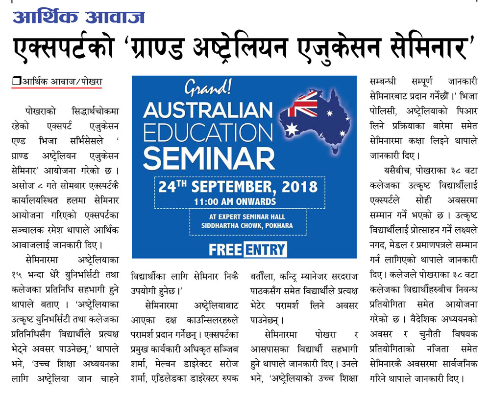 पोखरा । पोखराको सिद्धार्थचोकमा रहेको एक्सपर्ट एजुकेसन एण्ड भिजा सर्भिसेसले ‘ग्राण्ड अष्ट्रेलियन एजुकेसन सेमिनार’ आयोजना गर्ने भएको छ । असोज ८ गते सोमबार एक्स्पर्टकै कार्यालयस्थित हलमा सेमिनार गरिने एक्सपर्टका सञ्चालक रमेश थापाले आर्थिक आवाजलाई जानकारी दिए ।