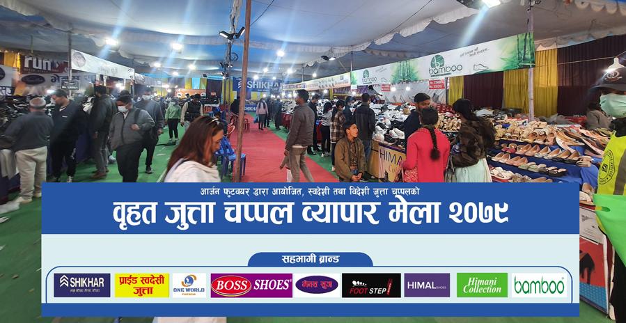 काठमाडौं । काठमाडौंको भृकुटीमण्डपमा ‘वृहत जुत्ता चप्पल व्यापार मेला’मा जारी छ । मेलामा जुत्ता चप्पल खरिद गर्नेहरुको आकर्षण देखिएको छ । विशेष छुटसहित सस्तो मूल्यमा जुत्ता चप्पल खरिदको अवसर मिलेसँगै मेलामा जुत्ता चप्पल खरिद गर्नेहरुको आकर्षण देखिएको आयोजकको भनाइ छ ।