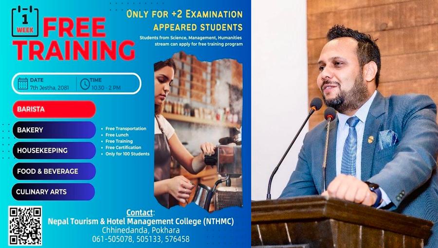 पोखरा । नेपाल टुरिजम एण्ड होटल म्यानेजमेन्ट कलेज छिनेडाँडा पोखराले प्लस टुको परीक्षा दिएर बसेका विद्यार्थीलाई लक्षित गरी निःशुल्क तालिम सञ्चालन गर्ने भएको छ । यस अगाडि एसईई दिएर बसेका विद्यार्थीलाई निःशुल्क तालिम दिएको कलेजले अब प्लस टु दिएर बसेका विद्यार्थीलाई लक्षित गरी तालिम दिन लागेको हो ।