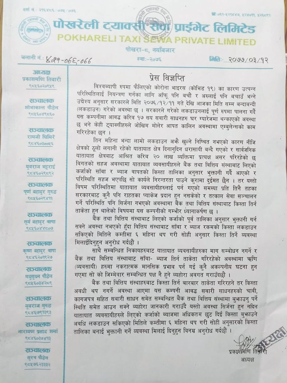 पोखरा । पोखरेली ट्याक्सी सेवा प्रा.लि. ले बैंकबाट लिएको रकमको सावा तथा ब्याज तिर्ने समय अवधी बढाउन बैंक तथा बित्तीय संस्थासँग आग्रह गरेको छ । लकडाउन सकिएको मितिले ६ महिना पछि मात्र बैंक तथा बित्तीय संस्थामा रकम बुझाउने वातावरण बनाउन विज्ञप्ती मार्फत आग्रह गरिएको छ ।