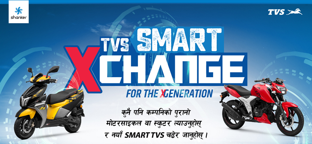 पुरानो मोटरसाइकल तथा स्कुटर एक्स्चेन्ज गरी नयाँ स्मार्ट टिभिएस चढ्ने अवसर ग्राहकले प्राप्त गर्ने पोखरेलले बताए । टिभिएसका लागि नेपालको आधिकारिक बिक्रेता जगदम्बा मोटर्स हो ।