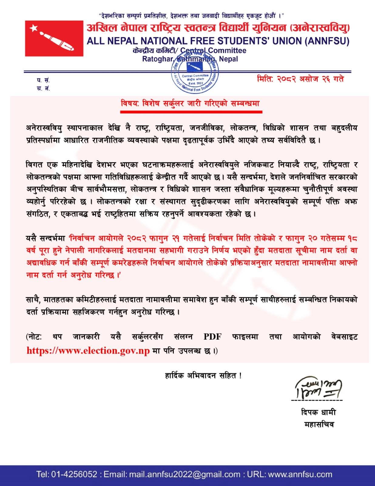 अनेरास्ववियुले १८ वर्ष पूरा भएका सबै नेपाली नागरिकलाई मतदाता नामावलीमा नाम दर्ता गर्न र पहिले नै दर्ता भइसकेकाहरूलाई आफ्नो सम्बन्धित राजनीतिक निकायको दर्ता प्रक्रियामा सक्रिय सहभागिता जनाउन निर्देशन दिएको छ । संघले लोकतान्त्रिक अभ्यासलाई बलियो बनाउन, राष्ट्रिय हितको रक्षा गर्न र जनसहभागिता अभिवृद्धि गर्न यो सर्कुलर जारी गरिएको जनाएको छ ।
