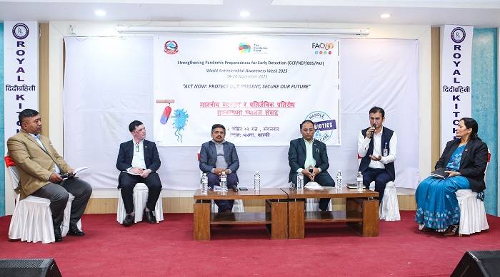 पशु सेवा विभागको आयोजना, पशुपन्क्षी रोग अन्वेषण प्रयोगशाला पोखराको संयोजन र खाद्य तथा कृषि संगठन एफ ए नेपालको सहयोगमा आयोजित ‘मानवीय व्यवहारसँग जोडिएको जैविक प्रतिरोध’ विषयक संवादमा सहभागीहरुले एन्टिबायोटिकको अनियन्त्रित प्रयोगका कारण गम्भीर स्वास्थ्य संकटतर्फ धकेलिँदै गएको बताएका हुन ।