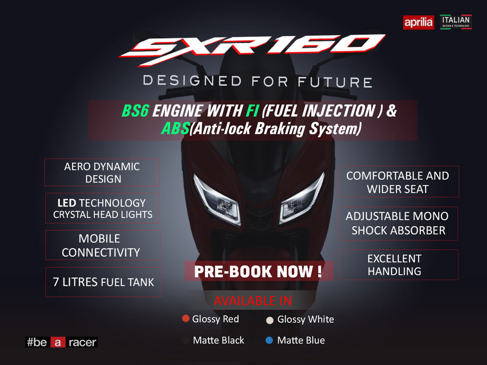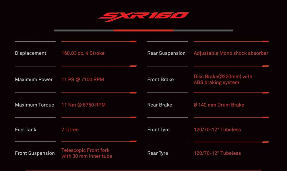 एफआइ इन्जिन र एबिएस (एन्टी लक ब्रेकिङ सिस्टम) सहित अप्रिलाको एसएक्सआर १६० नेपाली बजारमा उपलब्ध हुनेछ । एरो डाइनामिक डिजाइन, एलइडी टेक्नोलोजी क्रिस्टल हेड लाइट, मोबाइल कनेक्टिभी, कम्फरटेबल र वाइडर सिट, एडजस्टेबल मोनो सक एब्जोबर, एक्स्लेन्ट ह्याण्डलिङ लगायतका विशेषता एसएक्स्आर १६० मा रहेको छ । ७ लिटर क्षमताको फ्युल ट्यांकी छ ।