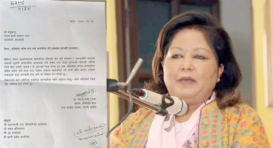 उनले साइबर ब्यूरो भोटाहिटीमा केही सञ्चारमाध्यम र सामाजिक सञ्जालमा सार्वजनिक गरिएको उक्त फेक अडियो बदनियतपूर्ण ढङ्गबाट बदनाम गराउने उद्देश्यले नियोजितरूपमा रेकर्ड गराइएको भन्दै कारबाहीको दायरामा ल्याउन माग गरेकी हुन् ।
