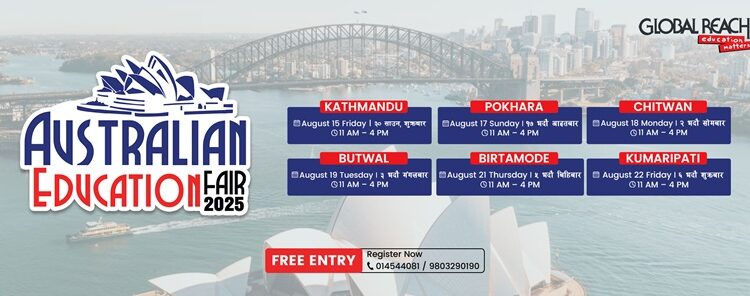 काठमाडौं । उच्च शिक्षा अध्ययनका लागि विदेश जान चाहने विद्यार्थीलाई लक्षित गरी ग्लोबल रिचले ‘अस्ट्रेलियन एजुकेशन फेयर २०२५’ गर्ने भएको छ । ग्लोबल रिचले काठमाडौं, पोखरा, चितवन, बुटवल, बिर्तामोड र कुमारीपाटीमा फेयर गर्न लागेको हो ।