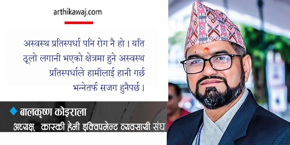 हेभी इक्विपमेण्ट व्यवसायीहरुले राज्यलाई आवश्यक परेको बेला दिल खोलेर सहयोग गर्दै आइरहेका छन् खासगरी दैवी विपत्तिको बेला हामीले यताउता केही नभनीकन राज्यलाई सघाएका छौं । तर, राज्यले हामीलाई कहिल्यै नसघाएको हाम्रो गुनासो छ ।