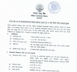 काठमाडौं । नेपाल राष्ट्र बैंकले १० अर्ब रुपैयाँ बराबरको विकास ऋणपत्र बिक्री गर्ने भएको छ । बैंकले यही जेठ ५ गते ऋणपत्र बिक्री गर्न लागेको हो ।