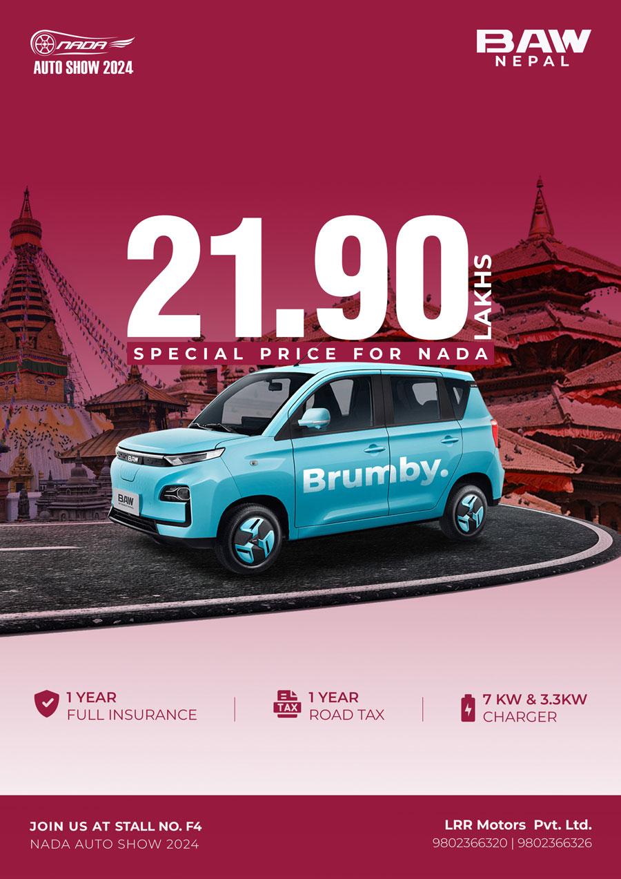 काठमाडौं । काठमाडौंमा जारी नाडा अटो शोमा सस्तो विद्युतीय गाडी ब्रम्बी प्रदर्शनीमा राखिएको छ । नाडा अटो शो अवधिभर विशेष छुटमा गाडी बुकिङको सुविधा उपलब्ध गराइएको छ । बेइजिङ अटोमोबाइल वर्क (बीएडब्लू) ले उत्पादन गरेको चिनियाँ गाडी ब्रम्बी ईभी २१ लाख ९० हजार रुपैयाँमा खरिद गर्न पाइन्छ । यो गाडीको बजार मूल्य २३ लाख भएपनि नाडा अटो शो भर विशेष छुट प्रदान गरिएको हो ।
