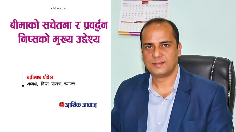 नेपाल इन्स्योरेन्स प्रोफेसनल सोसाइटी (निप्स) पोखरा च्याप्टर बीमा क्षेत्रमा आबद्ध अफिसरहरुको संस्था हो । गण्डकी कार्यक्षेत्र रहेको संस्थाले निर्जीवन र जीवन बीमाको प्रवर्द्धन तथा प्रचारप्रसार लगायतमा काम गर्दै आइरहको छ । यसैक्रममा संस्थाले चैत ९ गते शुक्रबार १२औं स्थापना दिवस मनाउँदैछ । यसैक्रममा निप्स पोखरा च्याप्टर अध्यक्ष बद्रीनाथ पौडेलसँग आर्थिक आवाजले गरेको कुराकानीः