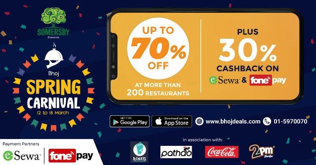 यो दौरानमा उपत्यका भित्रका रेष्टुराँहरुबाट खाना अर्डर गरे वापत ७० प्रतिशतसम्म छुट पाइने र इसेवा र फोनपेका माध्ययमबाट बिल तिर्दा ३० प्रतिशत क्यास ब्याक पाइने भोजको संस्थापक निकेत अग्रवालले बताए।