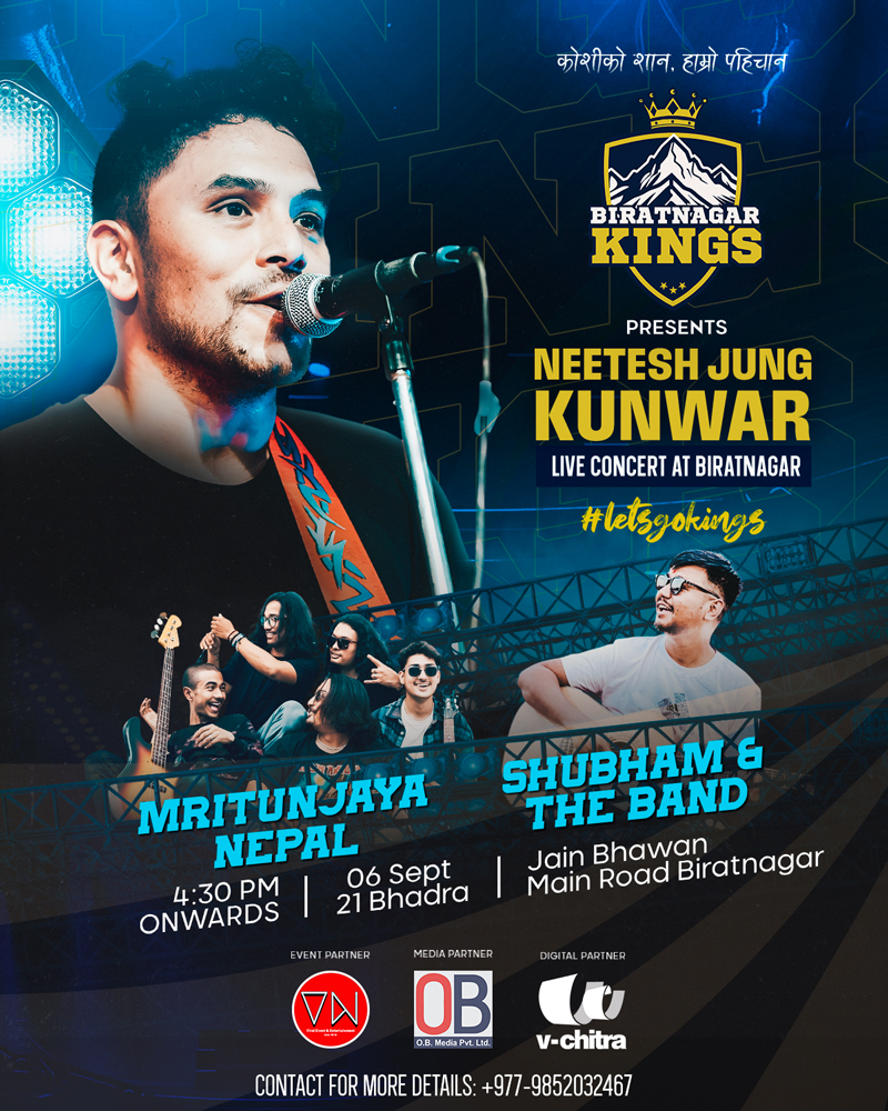 काठमाडौं । एनपीएल टिम विराटनगर किङ्सले कोशी प्रदेशको राजधानी विराटनगरस्थित जैन भवनमा यहि भाद्र २१ गते शनिबार एक रोमाञ्चक सांगीतिक कार्यक्रम आयोजना गर्ने भएको छ । कार्यक्रममा नेपालका चर्चित युवा आइकन गायक नितेश जंग कुँवरले प्रस्तुति दिनेछन् । उनी कार्यक्रमको मुख्य आकर्षण बन्नेछन् । स्थानीय कलाकारहरू शुभम एण्ड द ब्याण्ड र मृत्युन्जयले पनि आ–आफ्नो प्रस्तुति राख्नेछन् ।