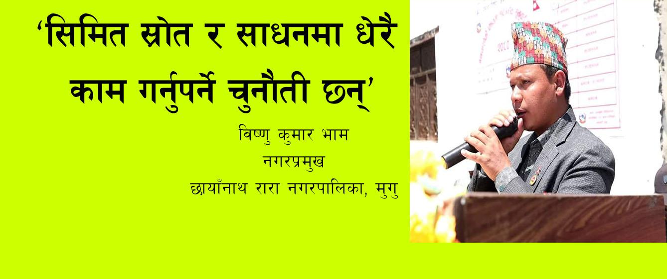 छायाँनाथ रारा नगरपालिका मुगुका नगरप्रमुख विष्णु कुमार भाम कर्णाली प्रदेशकै कान्छो मेयरका रुपमा स्थानीय सरकारको बागडोर सम्हालेका छन् । स्थानीयतहका योजनामा नागरिक सभागिता र पारदर्शितालाई प्राथमिकता दिँदै आएको बताउने भाम दीर्घकालीन प्रभावका योजनाका काम भएको बताउँछन् । उनको नगरमा श्रमदानबाट पनि धेरै काम भएको उनको भनाइ छ । अर्थिक आवाजसँग उनले नगरका गतिविधि, कार्य प्रक्रिया, प्राथमिकता लगायतका विषयमा कुरा गरेका छन् । भामसँग गरिएको कुराकानीको सम्पादित अंश :
