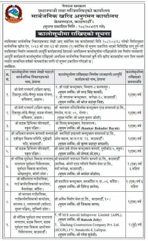 कार्यालयका अनुसार विभिन्न सरकारी निकायहरूले समयमै काम सम्पन्न नगरेको भन्दै ती कम्पनीहरूविरुद्ध कारबाही गर्न सिफारिस गरेका थिए। सोही अनुसार सार्वजनिक खरिद ऐन, २०६३ को दफा ६३ को उपदफा (१) बमोजिम ती कम्पनीहरूलाई एकदेखि दुई वर्षसम्मका लागि कालोसूचीमा राखिएको जनाइएको छ।