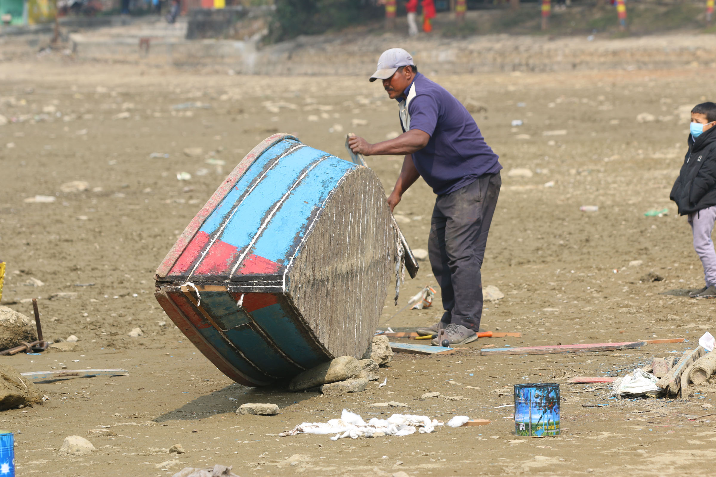 पोखराको फेवातालमा डुङ्गा मर्मत गर्दै डुङ्गा चालक ।