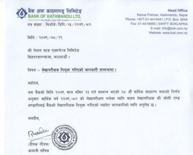 काठमाडौं । बैंक अफ काठमाण्डू लिमिटेडले लेखापरीक्षक नियुक्त गरेको छ ।