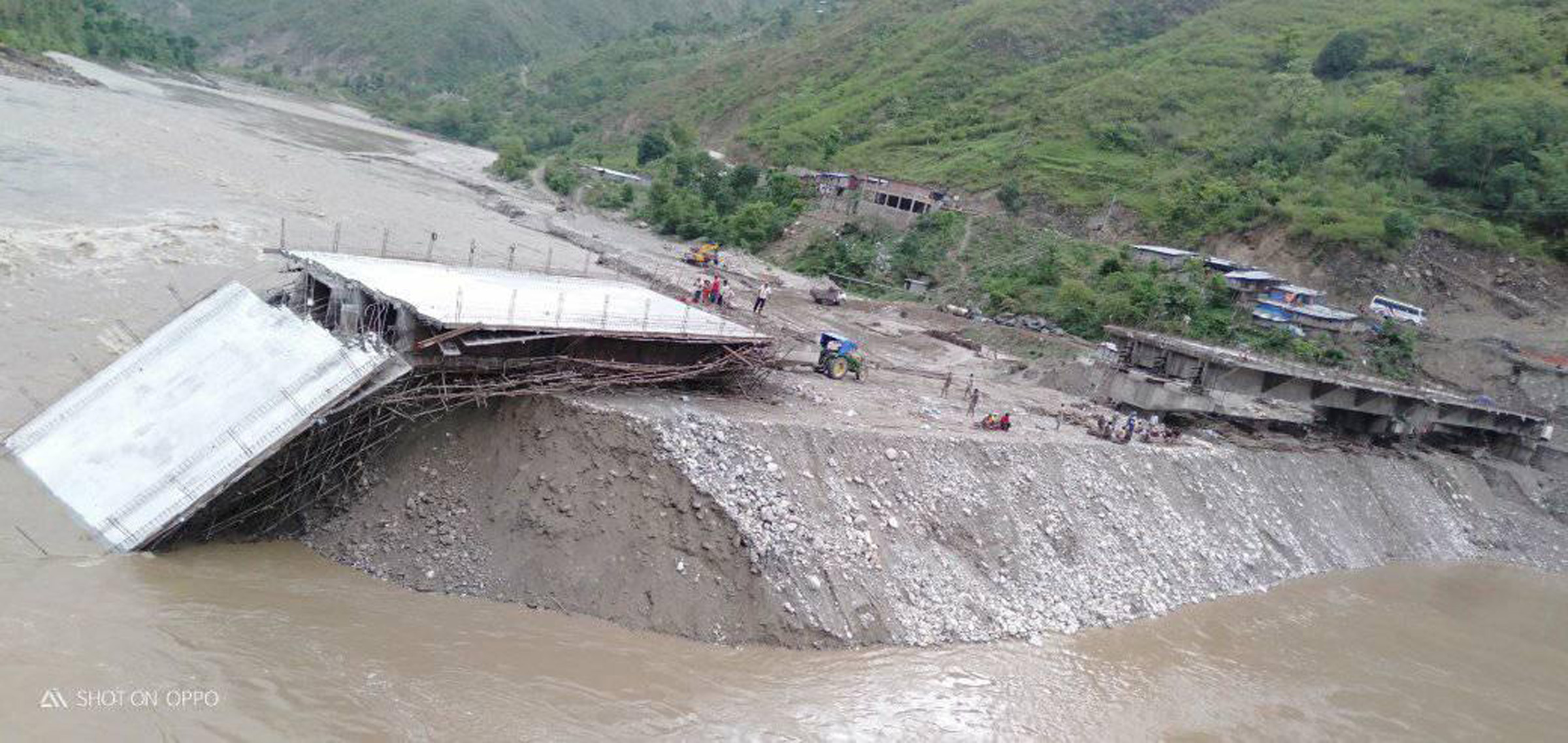 सुनकोशी नदीमा आएको बाढीले क्षति गरेको नवलपुरमा निर्माणाधीन पुल । ओखलढुंगाको चम्पादेवी गाउँपालिका– १ पलालु र सिन्धुलीको फिक्कल गाउँपालिका २ नवलपुरघाट जोड्ने मोटेरेबल पुल सुनकाशी नदी आएको बाढीले बगाएको हो । २१० मिटर लामो पुलको ४० मिटर भागमा बाढीले क्षति गरेको हो । करिब २३ करोडको लागतमा चुँदी कन्ट्रक्सन प्रा.लि सानेपाले पुल निर्माणको काम गरिरहेको थियो ।