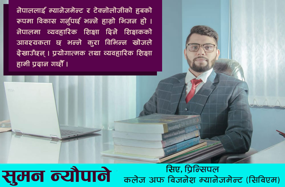सिए, प्रिन्सिपल, कलेज अफ बिजनेश म्यानेजमेन्ट (सिबिएम)शिक्षा क्षेत्रमा केही गरौं भन्ने उद्देश्यसहित चार्टर एकाउन्टेन्ट युवाहरुले सञ्चालन गरेको शैक्षिक संस्था हो कलेज अफ बिजनेश म्यानेजमेन्ट । काठमाडौंको डिल्लीबजारमा रहेको यो कलेजले एसईई सकेका विद्यार्थीहरुलाई लक्षित गरी प्लस टु म्यानेजमेन्टको परामर्श सेवा प्रदान गर्दैै आइरहेको छ । यसैक्रममा कलेजका प्रिन्सिपल सिए सुमन न्यौपानेसँग कलेजका विशेषता, म्यानेजमेन्ट अध्ययनको महत्व लगायत विविध विषयमा आर्थिक आवाजले गरेको कुराकानीः