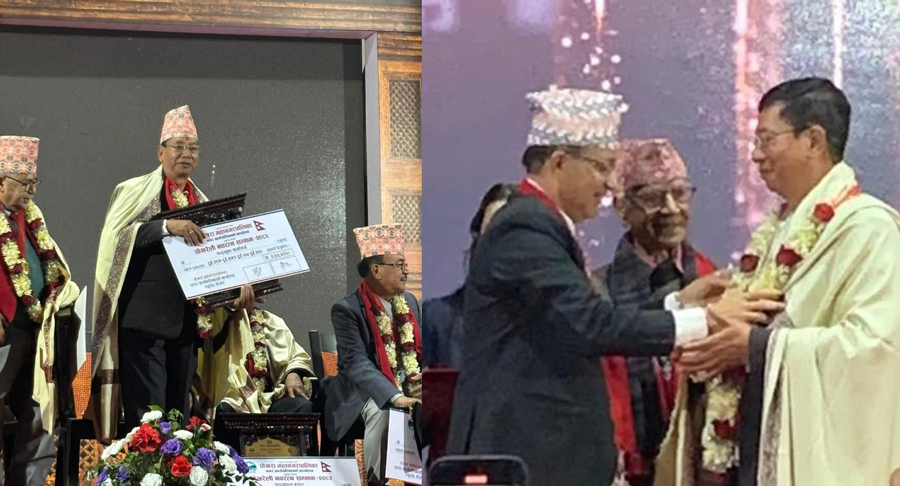 बुधबार आयोजित विशेष समारोहबीच गण्डकी प्रदेशका मुख्यमन्त्री सुरेन्द्रराज पाण्डे र पोखरा महानगरका प्रमुख धनराज आचार्यले कर्माचार्यलाई सम्मान अर्पण गरे ।
