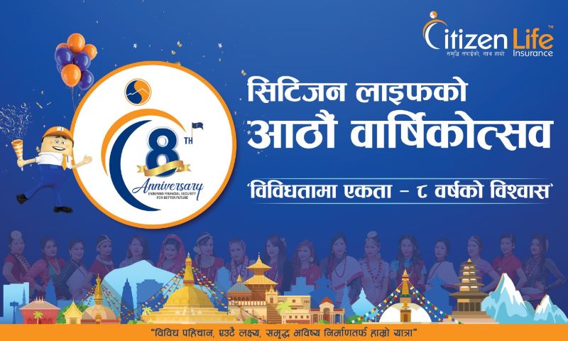 काठमाडौं । जीवन बीमाको माध्यमबाट नेपाली जनताको सपना सुरक्षित गर्दै, विश्वास र साथका साथ आठ वर्षको सफल यात्रा तय गरेको सिटिजन लाइफ इन्स्योरेन्स कम्पनी लिमिटेड आज आफ्नो आठौं वार्षिकोत्सव देशभरका शाखा कार्यालयमा विविध सामाजिक उत्तरदायित्व गतिविधिका साथ मनाउँदैछ ।