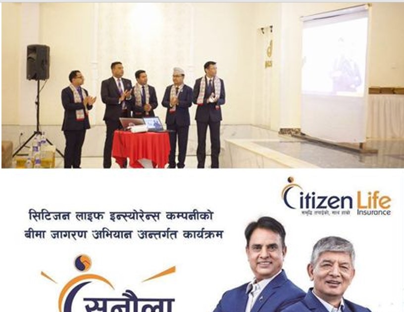 काठमाडौं । सिटिजन लाइफ इन्स्योरेन्स कम्पनीले चैत २४ गते शुक्रबारदेखी २०८० साल असार मसान्तसम्म जीवन बीमा जागरण अभियान अन्तर्गत सुनौलो १०० दिन कार्यक्रमको सुरुवात गरेको छ । पुरै देश आर्थिक तरलता संकटबाट गुज्रिरहेको यस चुनौतीपुर्ण समयलाई अवसरमा परिवर्तन गर्ने उद्देश्यका साथ यस अभियानको आयोजना गरेको कम्पनीले जनाएको छ ।