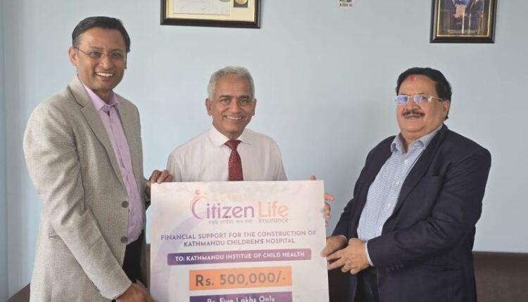 सिटिजन लाइफ इन्स्योरेन्सका अध्यक्ष प्रदीपजंग पाण्डे र प्रमुख कार्यकारी अधिकृत पोषकराज पौडेलले काठमाडौं इन्स्टीच्युट अफ चाइल्ड हेल्थका अध्यक्ष प्रोफेसर डा. भगवान कोइरालालाई ५ लाखको चेक हस्तान्तरण गरेका छन् । सिटिजन लाइफले आफ्नो सामाजिक जिम्मेवारी अन्तर्गत विभिन्न पहलहरु गर्दै समुदायमा सकारात्मक परिवर्तन ल्याउने कार्यक्रमहरु सञ्चालन गरी आफ्नो दायित्व पूरा गर्दै आएको छ ।