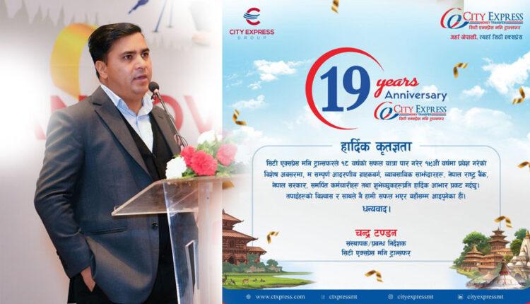 काठमाडौं । नेपाली मनी ट्रान्सफर क्षेत्रको अग्रणी संस्था सिटी एक्सप्रेस मनि ट्रान्सफरले स्थापनाको १९औं वर्षमा प्रवेश गरेको छ । ‘जहाँ नेपाली, त्यहाँ सिटी एक्सप्रेस’ नारासँगै कम्पनीले विगत १८ वर्षको सफल यात्रा पार गरेको छ ।