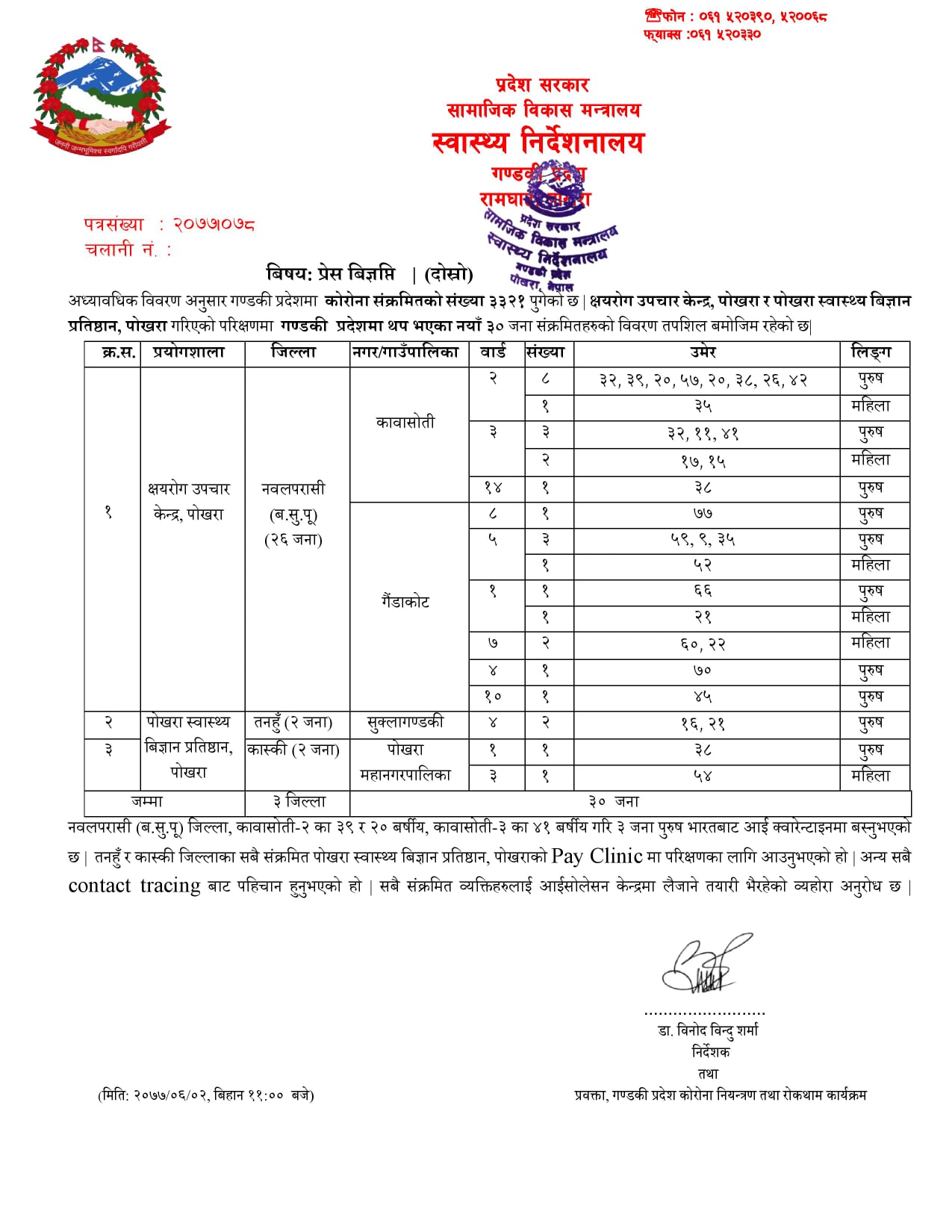 संक्रमित हुनेमा नवलपरासी पुर्वका २६ जना, तनहुँ र कास्कीका २÷२ जना रहेको स्वास्थ्य निर्देशनालयले जनाएको छ ।