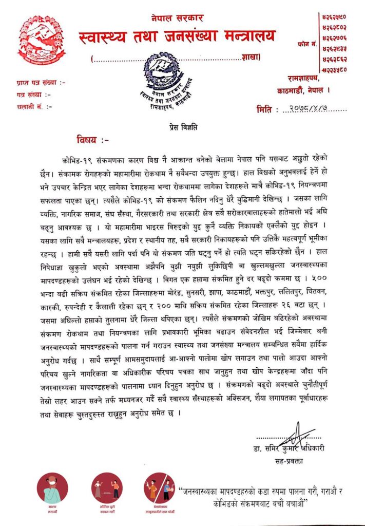 काठमाडौं । स्वास्थ्य तथा जनसङ्ख्या मन्त्रालयले कोरोना भाइरस संक्रमणको तेस्रो लहर आउनसक्ने भएकाले सचेत रहन आग्रह गरेको छ । मन्त्रालयका सहप्रवक्ता डा समिरकुमार अधिकारीले आज विज्ञप्ति जारी गर्दै निषेधाज्ञा खुकुलो भएसँगै संक्रमण दर बढ्दो देखिएकाले तेस्रो लहर आउनसक्ने बताएका हुन् ।