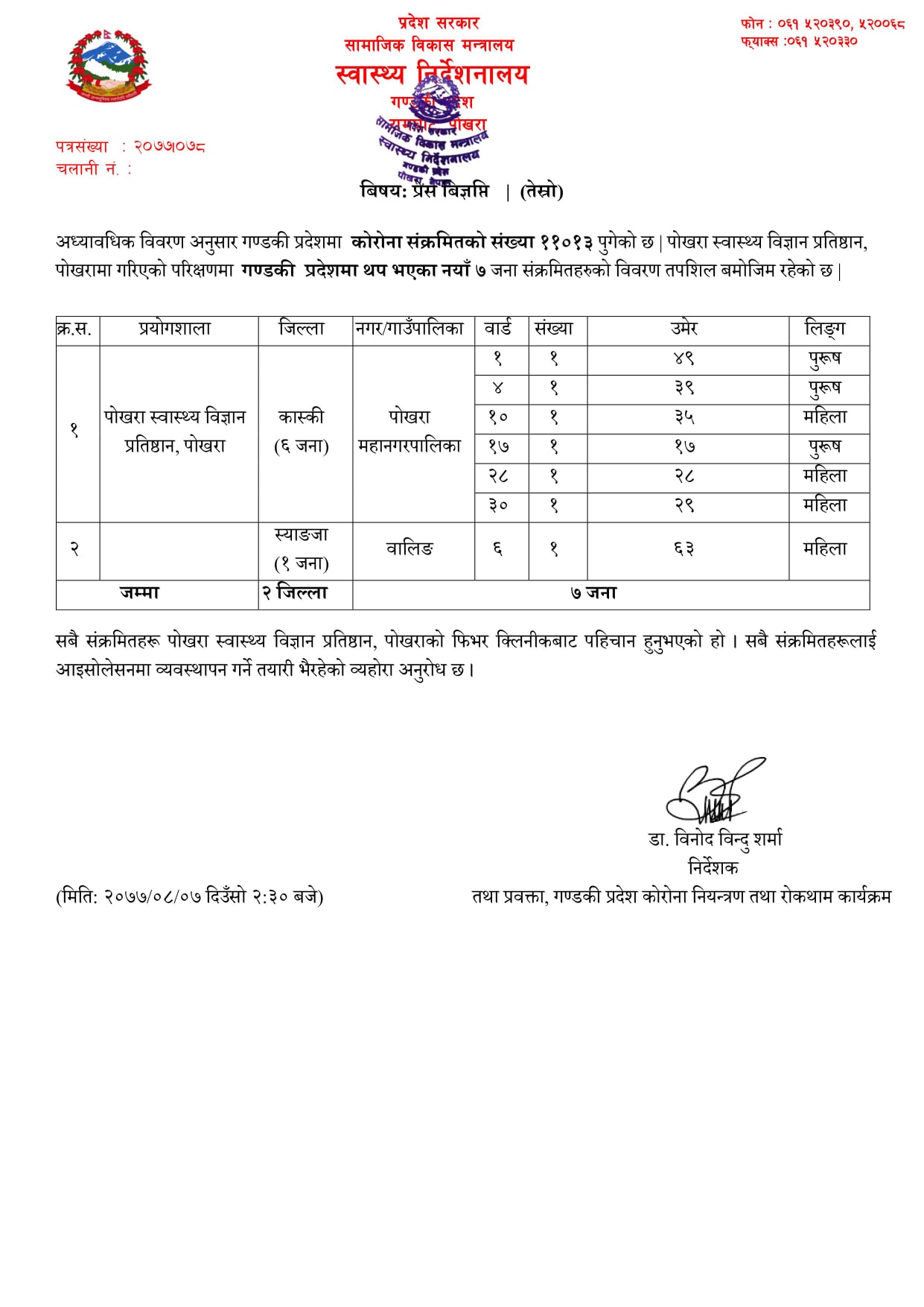 पोखरा । गण्डकी प्रदेशमा कोरोना संक्रमित थपिने क्रम जारी छ । पोखरा स्वास्थ्य विज्ञान प्रतिष्ठानमा गरिएको परिक्षणमा ७ संक्रमित थपिएका छन् ।