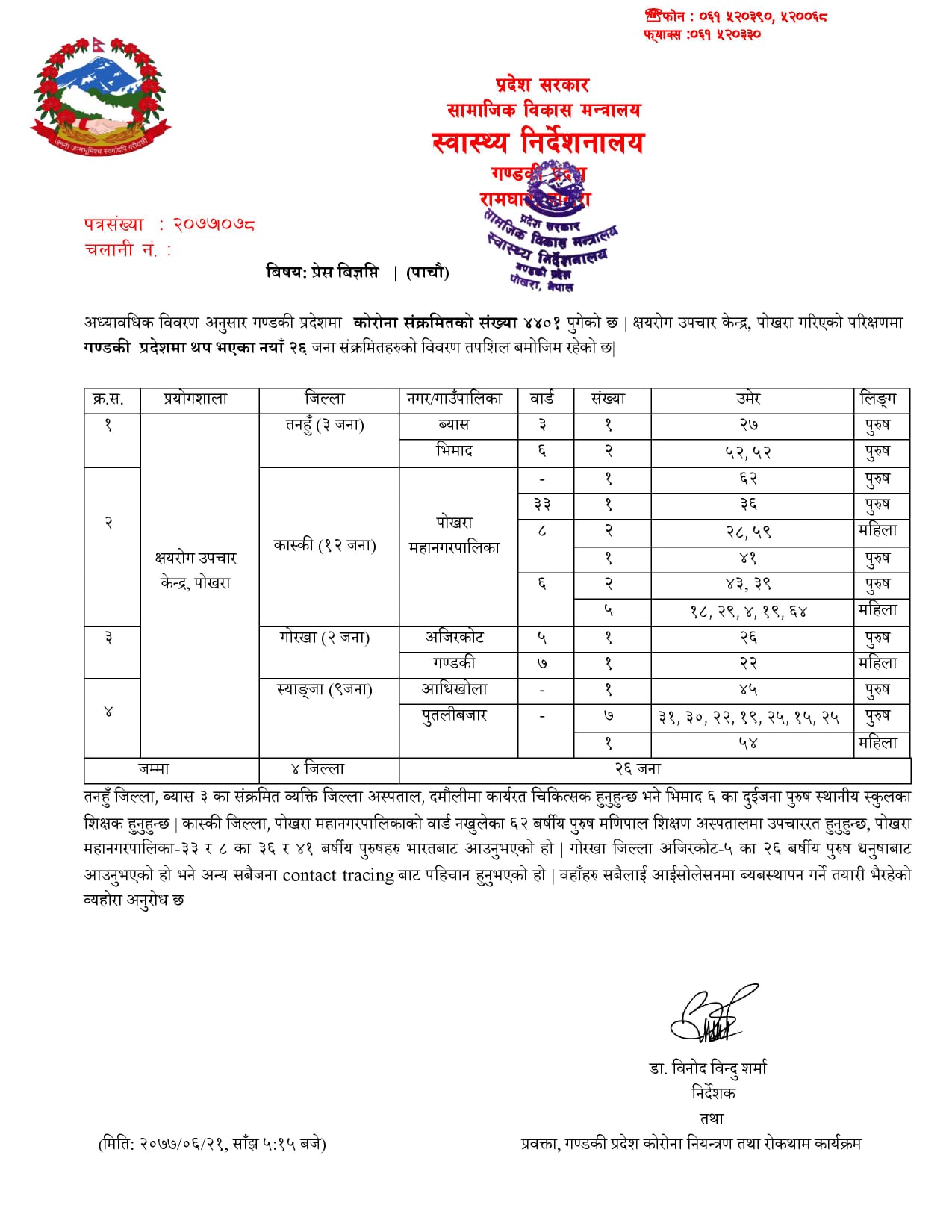 पोखरा । गण्डकी प्रदेशमा चिकित्सक र शिक्षकसहित थप २६ जनामा कोरोना संक्रमण पुष्टी भएको छ । यस सँगै प्रदेशमा संक्रमितको संख्या ४ हजार ४ सय १ पुगेको छ ।