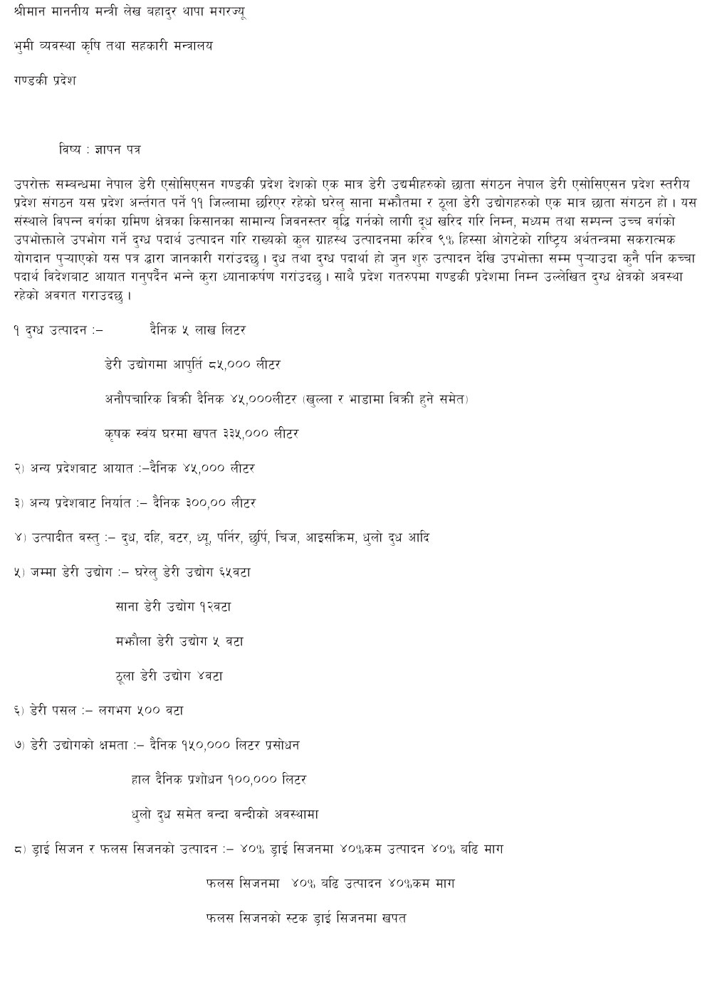 एसोसिएसनले कृषि, भूमि व्यवस्था तथा सहकारी मन्त्रालयका सचिव अच्युत ढकाललाई ज्ञापन पत्र बुझाएको हो । मन्त्री लेखबहादुर थापाको अनुपस्थिति रहेपछि एसोसिएसनले सचिवलाई ज्ञापन पत्र बुझाएको हो ।