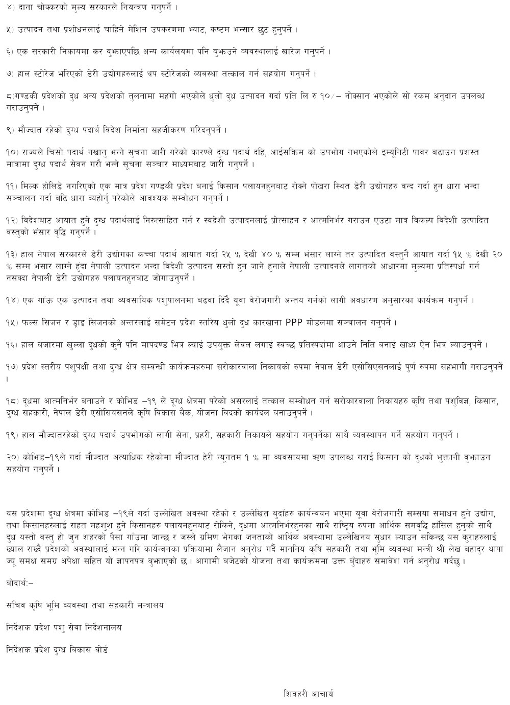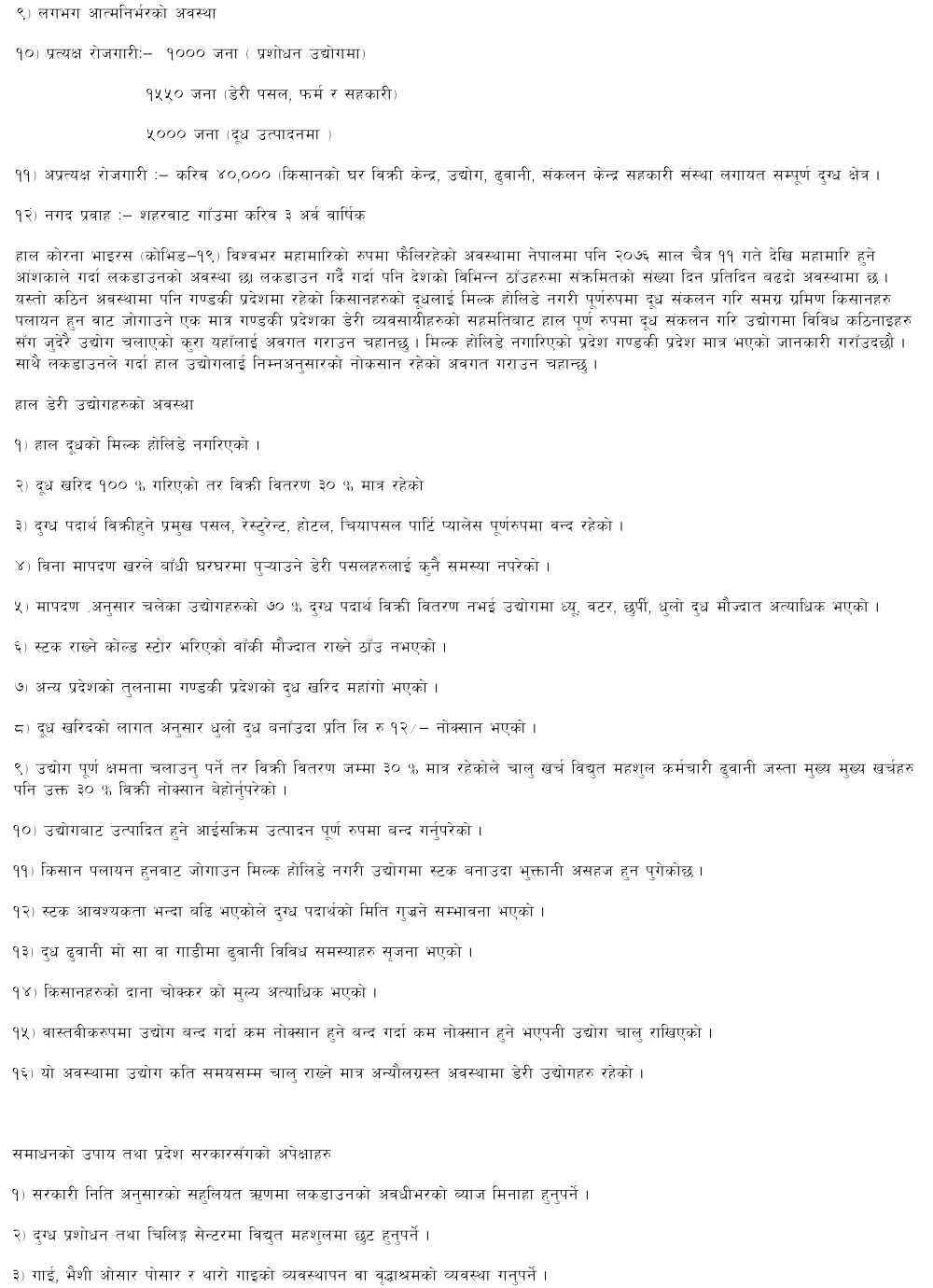 कोरोनाका कारण दुग्ध क्षेत्रको असर र प्रदेश सरकारसँगको अपेक्षा लगायतका बुँदा समेटेर ज्ञापनपत्र बुझाइएको अध्यक्ष शिवहरि आचार्यले जानकारी दिए । नेपाल डेरी एसोसिएसनका केन्द्रीय उपाध्यक्ष ज्ञानेन्द्र बजगाईं, गण्डकी प्रदेश अध्यक्ष शिवहरि आचार्य, सल्लाहकार सुरेशबहादुर श्रेष्ठ, जिल्ला सहकारी संघका वरिस्ठ प्रवन्धक भोजराज घिमिरे लगायतले ज्ञापनपत्र बुझाएका हुन् ।