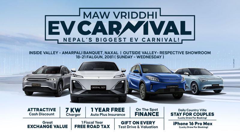 काठमाडौं । नेपालमा दिपाल, नामी र सेरेसको आधिकारिक वितरक एमएडब्लू वृद्धिले नेपालको सबैभन्दा ठूलो ईभी कार्निभल आयोजना गर्ने भएको छ । यो कार्यक्रम काठमाडौं उपत्यकाको अमरपाली बैंक्वेट, नक्सालमा फागुन १८ देखि २१ गतेसम्म बिहान ११ बजेदेखि साँझ ६ बजेसम्म दैनिक सञ्चालन हुनेछ ।