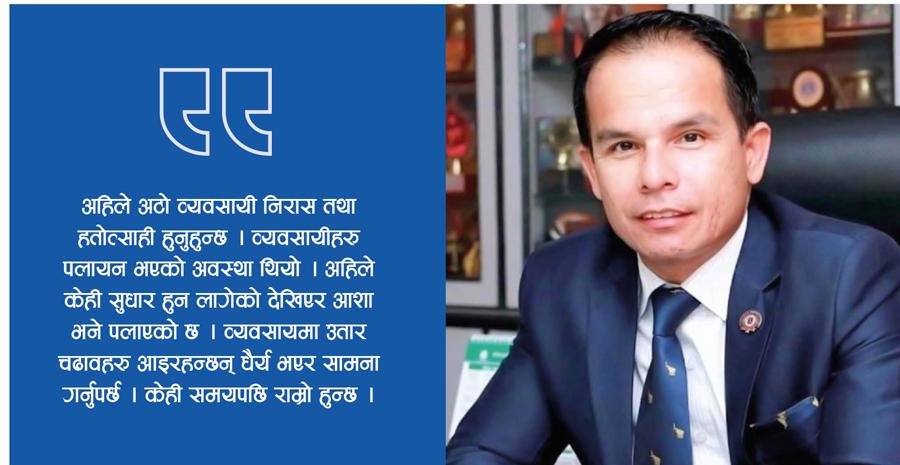 सरकारले ल्याएका विभिन्न नीति नियमले अटोमोबाइल व्यवसायमा चुनौती थपिएको छ । अहिले अटो मोबाइल व्यवसाय धरासायी अवस्थामा नै छ । केही सुधारोन्मुख भएपनि सरकारले नीति नियमलाई पुनर्मूल्याङकन नगर्दासम्म पहिलाको अवस्थामा जान सक्ने अवस्था छैन । राष्ट्र बैंकले ल्याएका नीति नियम, सरकारले ल्याएका नीति नियमका कारण अटोमोबाइल धेरै अप्ठ्यारो अवस्थामा छ । हामी विषम परिस्थितिकै बीचमा अगाडि बढेका छौं ।