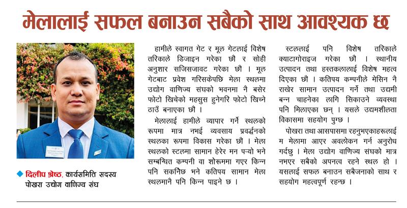मेला पोखरा उद्योग वाणिज्य संघको मात्र नभएर सबैको अपनत्व रहने स्थल हो । यसलाई सफल बनाउन सबैजनाको साथ र सहयोग महत्वपूर्ण रह्यो । आगामी दिनमा पनि सबैको साथ र सहयोग मिल्नेमा हामी विस्वस्त छौं । पोखरासहित समग्र गण्डकी प्रदेशको आर्थिक गतिविधि बढाउन मेलाले सकारात्मक योगदान गरेको छ ।