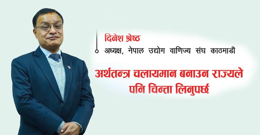 देशमा सबैभन्दा बढी आर्थिक गतिविधि हुने ठाउँ काठमाडौं हो । संघीय राजधानी शहर भएकाले पनि काठमाडौंको आर्थिक गतिविधिले देशभर प्रभाव पार्छ । पछिल्लो समय आर्थिक मन्दीको मारमा निजी क्षेत्र परेको छ । ठाउँठाउँमा व्यवसायीहरु विस्थापित हुने अवस्था आइसकेको छ । यसैक्रममा हामीले नेपाल उद्योग वाणिज्य संघ काठमाडौंका अध्यक्ष दिनेश श्रेष्ठसँग संघका समसामयिक गतिविधि, निजी क्षेत्रले भोग्नुपरेका समस्या लगायत विविध विषयमा केन्द्रित रहेर कुराकानी गरेका छौं :