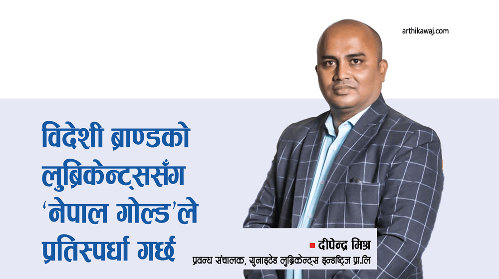 युनाइटेड लुब्रिकेन्ट्स इन्डष्ट्रिज प्रा.लि. नेपाली ब्राण्ड ‘नेपाल गोल्ड’को उत्पादन सुरु गरिसकेको छ । नेपाली ब्राण्डमा लुब्रिकेन्ट्स र ग्रिज उत्पादन सुरु गरेर देशभर बिक्री वितरण बिस्तार गरिरहेको उद्योगका सन्दर्भमा केन्द्रित रहेर प्रवन्ध सञ्चालक दीपेन्द्र मिश्रसँग हामीले गरेको कुराकानीः