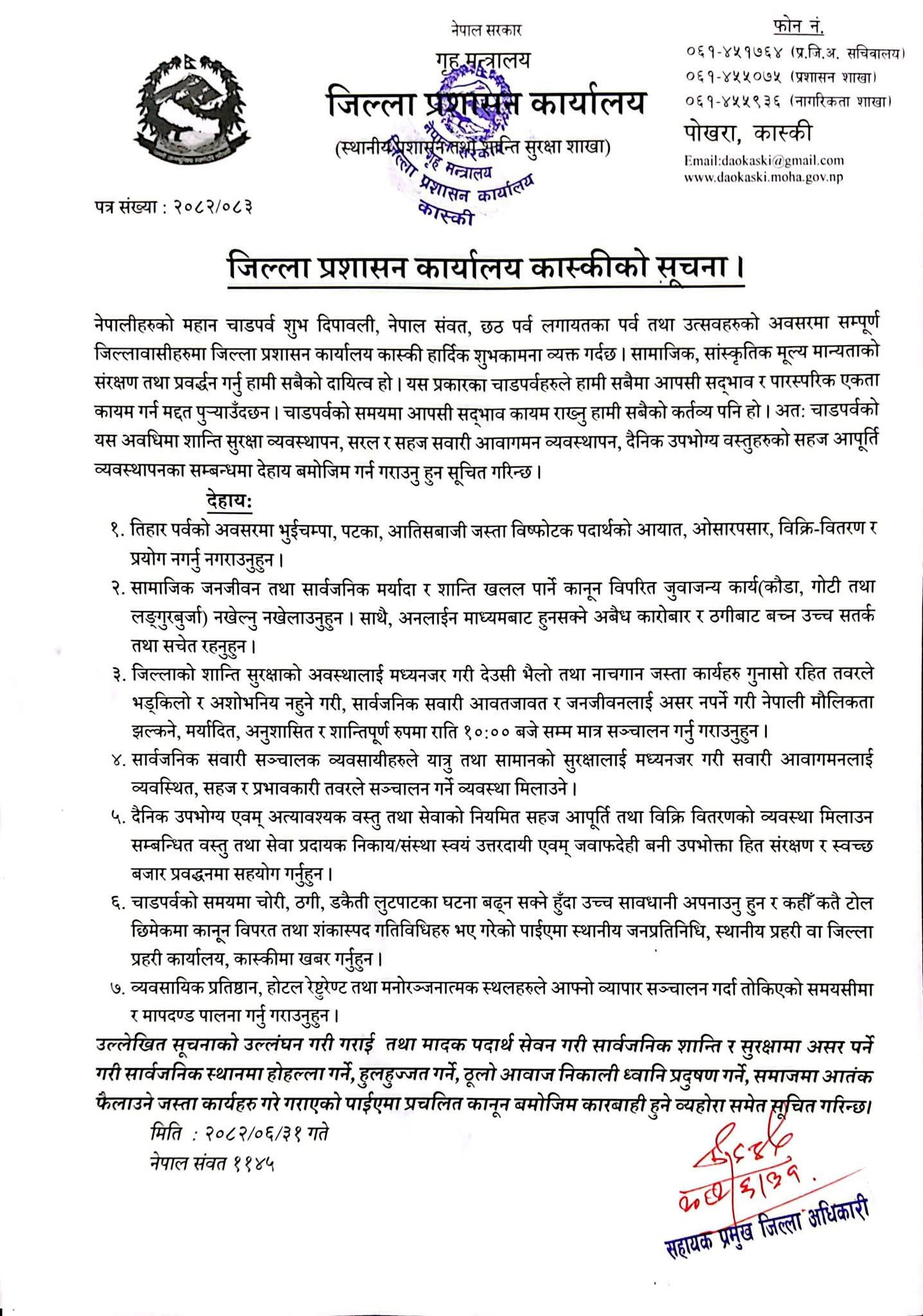 पोखरा । जिल्ला प्रशासन कार्यालय कास्कीले चाडपर्वहरू तिहार, नेपाल संवत्, छठ लगायतका पर्वहरूलाई शान्तिपूर्ण, मर्यादित र सुरक्षित ढङ्गले मनाउनका लागि सात बुँदे निर्देशन जारी गरेको छ । प्रशासनले सामाजिक, सांस्कृतिक मूल्य–मान्यताको संरक्षण गर्दै सबै नागरिकलाई चाडपर्वको समयमा जिम्मेवार र सचेत रहन आग्रह गरेको हो ।
