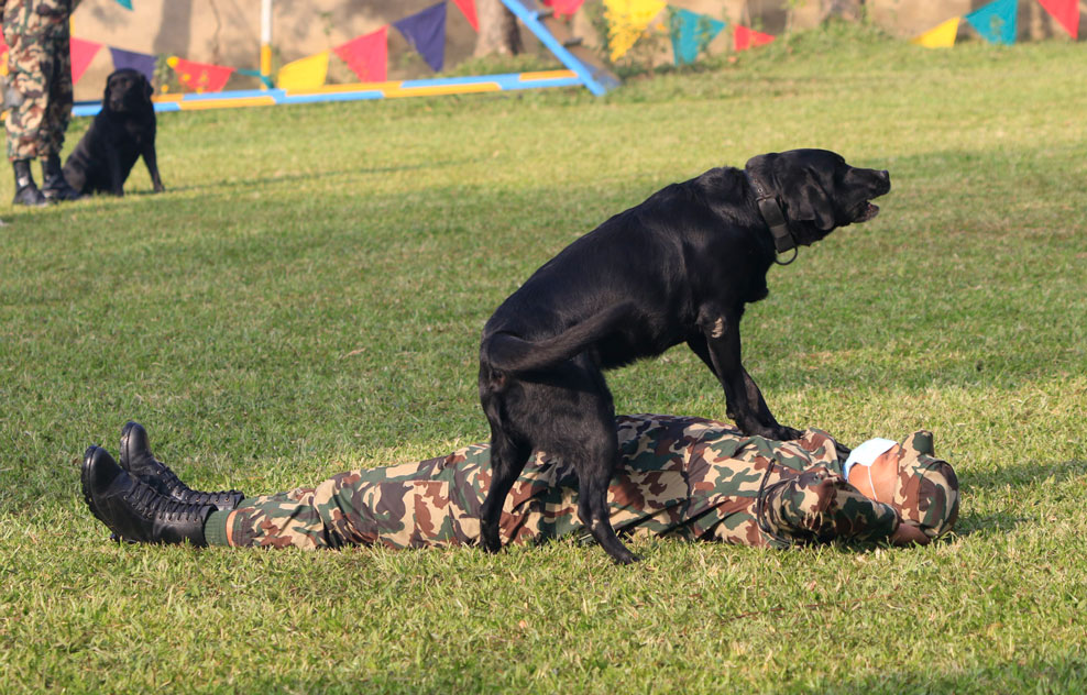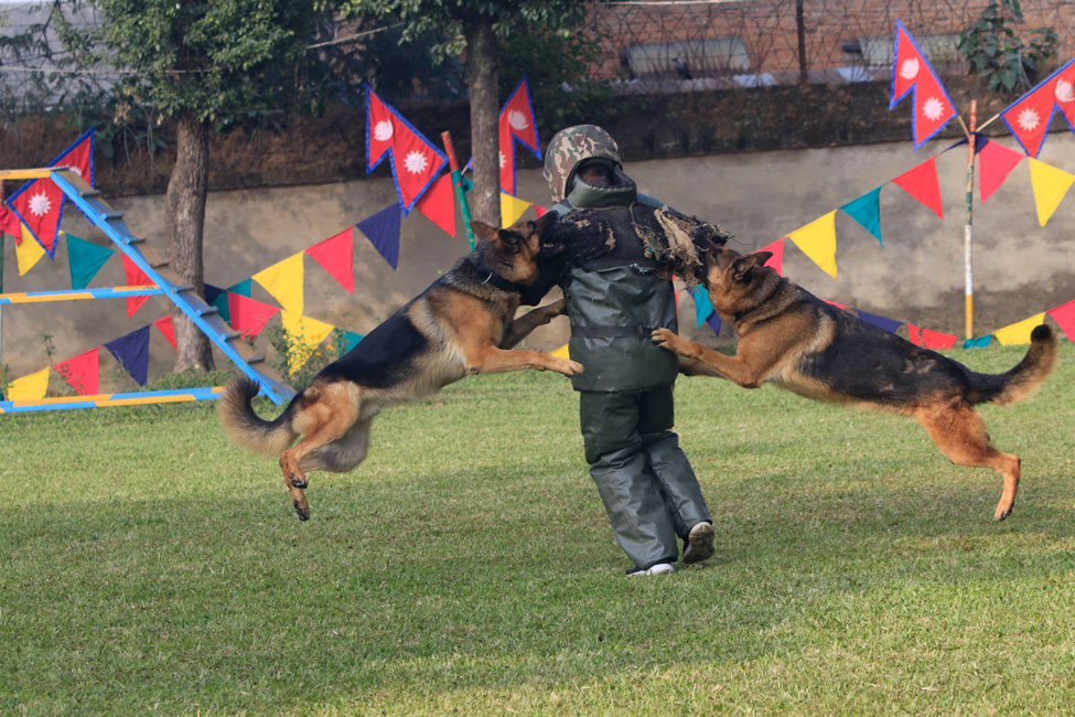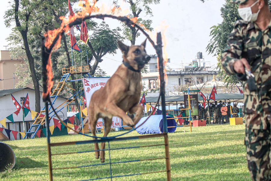 मध्यपुर थिमि–२ सानो थिमिस्थित भैरव बहान गुल्ममा कुकुर तिहारको दिन बुधबार कुकुर पूजाअघि विभिन्न कला प्रदर्शन देखाउँदै तालिम प्राप्त कुकुर । विभिन्न जातका ८८ वटा कुकुरलाई तालिम दिई प्रदर्शनीसमेत गर्न लगाइएको थियो ।