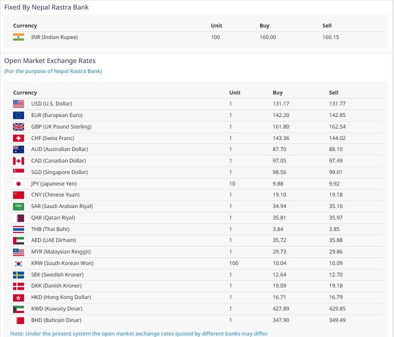 त्यस्तै, आज भारतीय रुपैयाँ एक सयको खरिद दर १६० रुपैयाँ रहेको छ भने बिक्री दर १६१ रुपैयाँ १५ पैसा, युरो एकको खरिद दर १४२ रुपैयाँ २० पैसा र बिक्री दर १४३ रुपैयाँ ८५ पैसा, बेलायती पाउण्ड एकको खरिद दर १६१ रुपैयाँ ८० पैसा र बिक्रीदर १६२ रुपैयाँ ५४ पैसा राष्ट्र बैंकले तोकेको छ । आज युरो र बेलायती पाउण्डको मूल्य घटेको हो ।